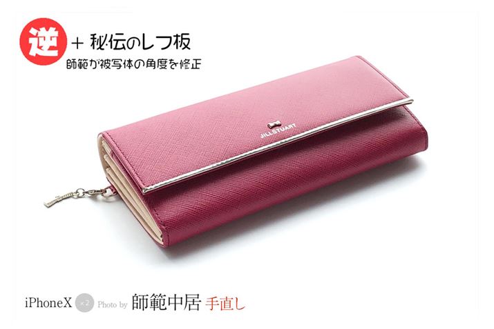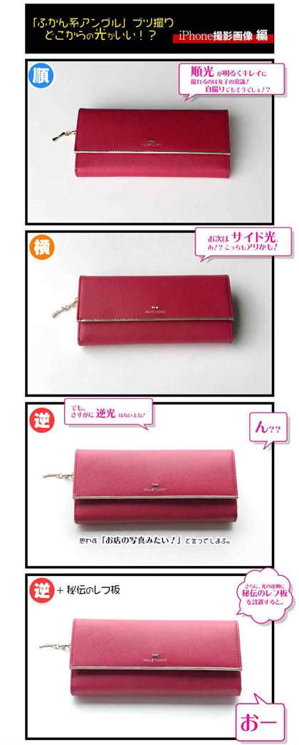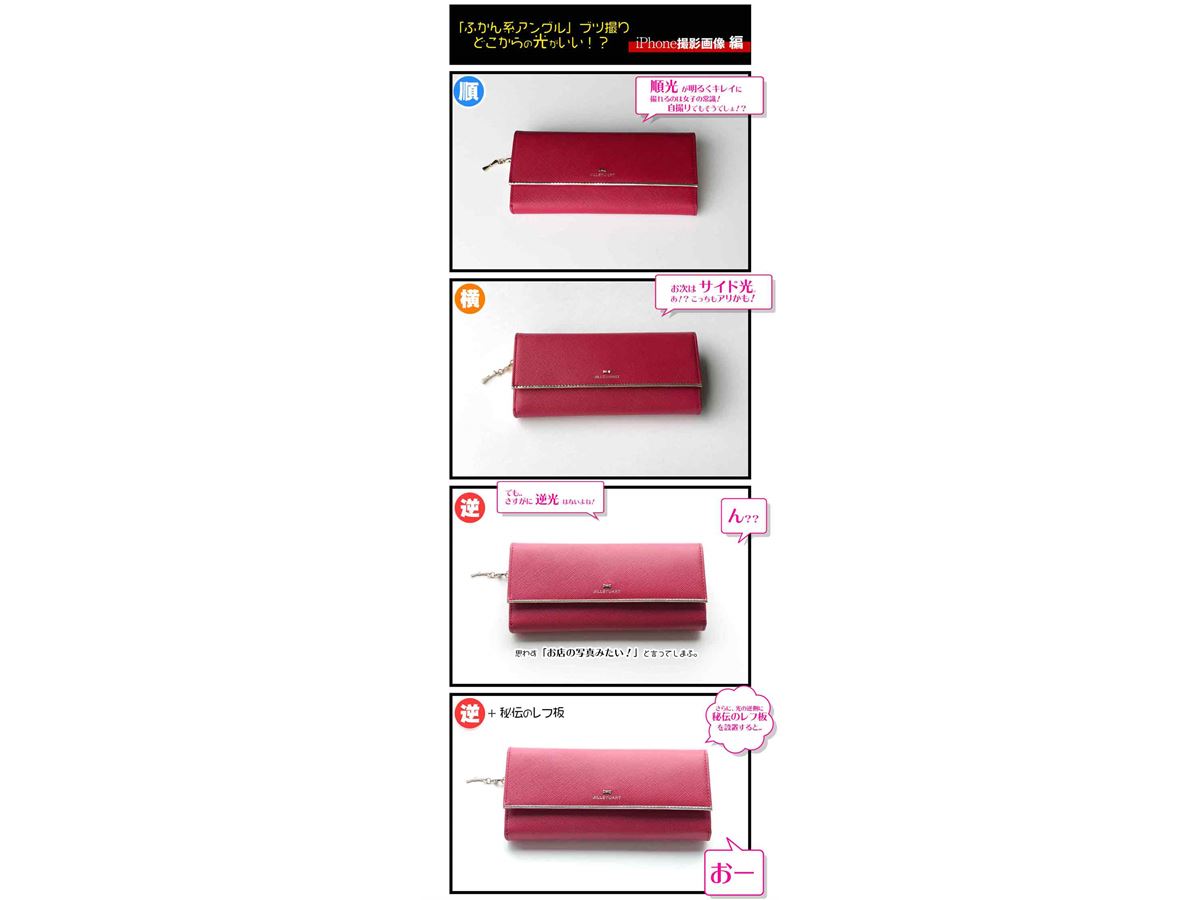 ふかん系アングル(水平に対して45〜90度)で、しえるさまに長さ20cmほどの長財布を撮ってもらうことにしました。このとき、しえるさまは「明るく撮るには順光(撮影者の背中に光を背負う方向)に決まってる!」と主張されます。
