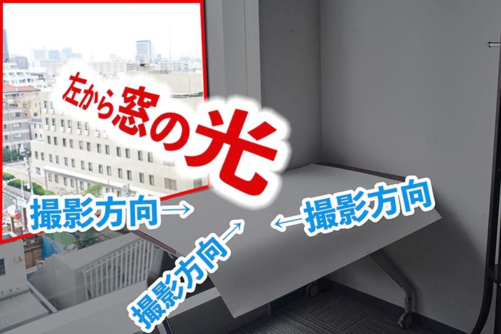 このとき、直射日光は避けてください(直射日光が入る場合は、トレーシングペーパーなどで光を拡散させる必要があります)。また、夕方などは光がオレンジ色になるので避けたほうがいいです(意外にも曇天の日が、光が安定していて1日中撮影がしやすいです……)。
