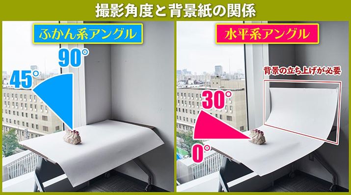 高さのない被写体は、カメラを上から下に構えるので、背景紙をテーブル(天板)に敷くだけの平面で撮ることができます(水平に対して、45〜90度の撮影)。