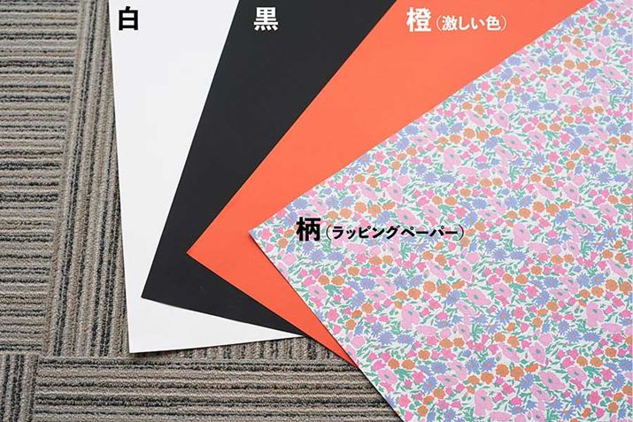 白・黒・橙(だいだい)・柄(ラッピングペーパー)の色紙を用意してみました。