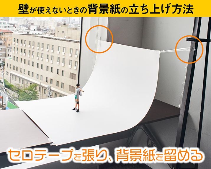 壁にテープで張れればいいのですが、今回の撮影場所の場合は窓の端より奥まったところに壁があったため、窓の端に立ち上がりを合わせる必要がありました(背景が壁の陰で暗くなる)。このため、現場にあったコートハンガーを利用し、セロハンテープを駆使して、写真のように背景の立ち上がりを作りました。