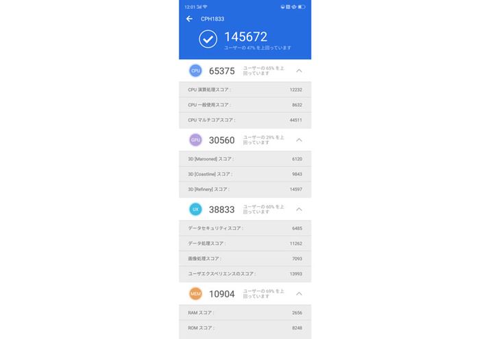 AnTuTuベンチマークの総合スコアは145,672。搭載されるSoCはハイエンド向けではなくミドルハイ向けということで、GPUのスコアが相対的に低い