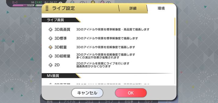「ミリシタ」ではライブ時の描画設定が「3D軽量」と判定されたが、「3D高画質」にしても、目立ったコマ落ちは現れなかった