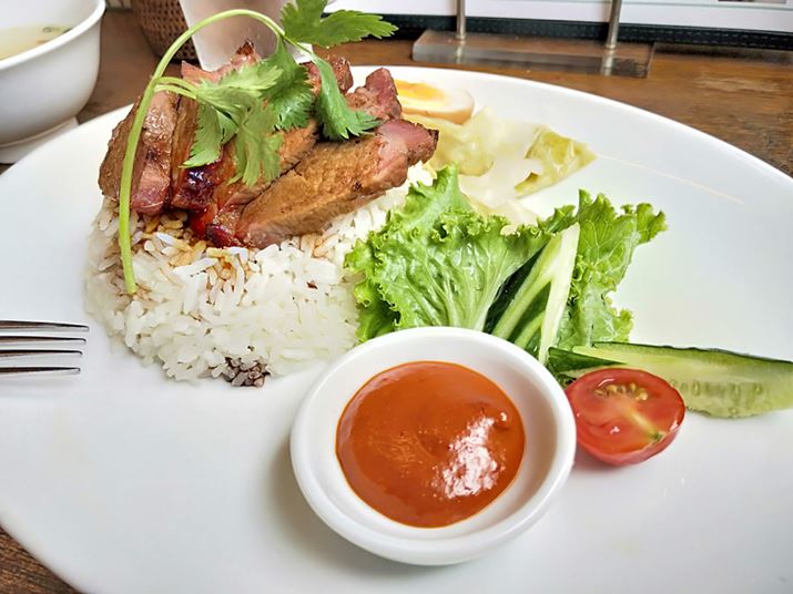 自然光の入るテーブルで料理を撮影。ライスの上に盛られた肉やレタスのみずみずしさ、小皿に盛られたチリソースの照りなどがより映える仕上がりだ