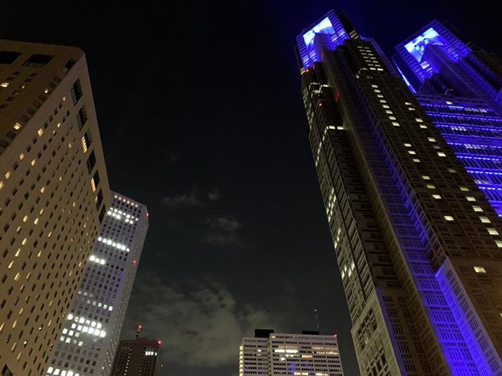 ライトアップされた東京都庁を下から撮影。上の階の小さな窓までクリアに映し出されている。ノイズはあるが、上手に処理されている