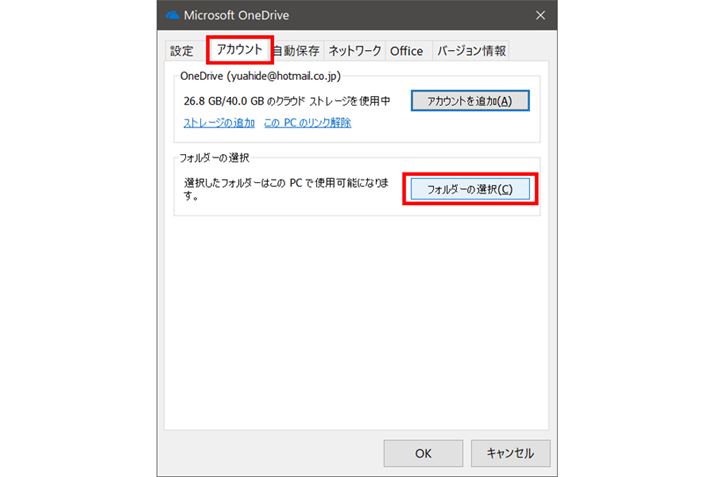 OneDriveの設定が表示される。ここで「アカウント」タブをクリックして開いたら、「フォルダーの選択」をクリックする