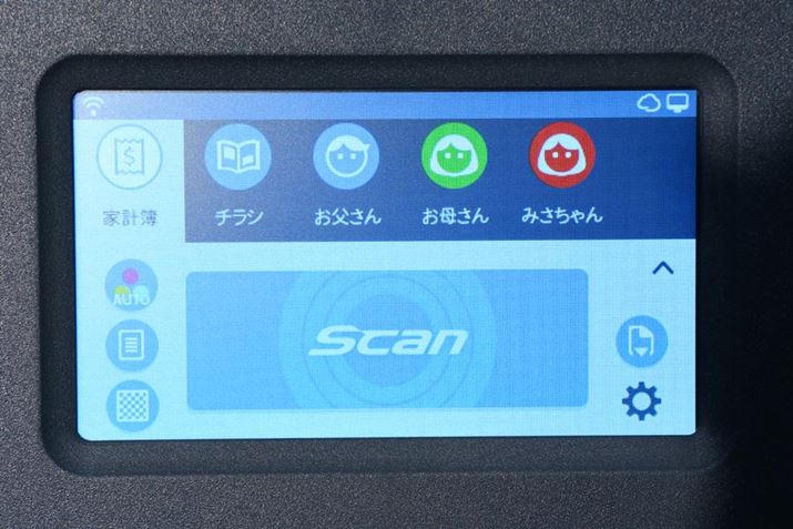 iX1500は4.3インチのタッチパネルを搭載し、直感的な操作を実現した。名刺なら「名刺管理を管理」、レシートなら「家計の支出を管理」、仕事の資料なら「会議資料を共有」というアイコンを選んで、下の「Scan」ボタンをタッチするだけで、スキャンできる。アイコンは、用途に合わせて保存先(「ScanSnap Cloud」と連携したクラウドサービスも選択可能)やカラーなどが設定可能。「学校の配布物を後で見る」「出張経費の精算」「写真のアルバムを作成」など、20種類以上のテンプレートが用意されており、タッチパネルには最大30個まで登録しておける。