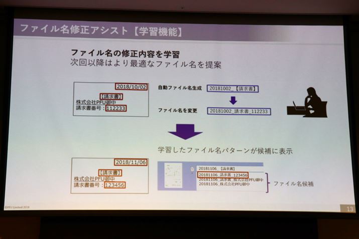 「ファイル名修正アシスト」の詳細。自動でファイル名が生成され、それを手動で変更すると、その変更を学習し、次回以降に反映される。使えば使うほど、その精度は高まっていく