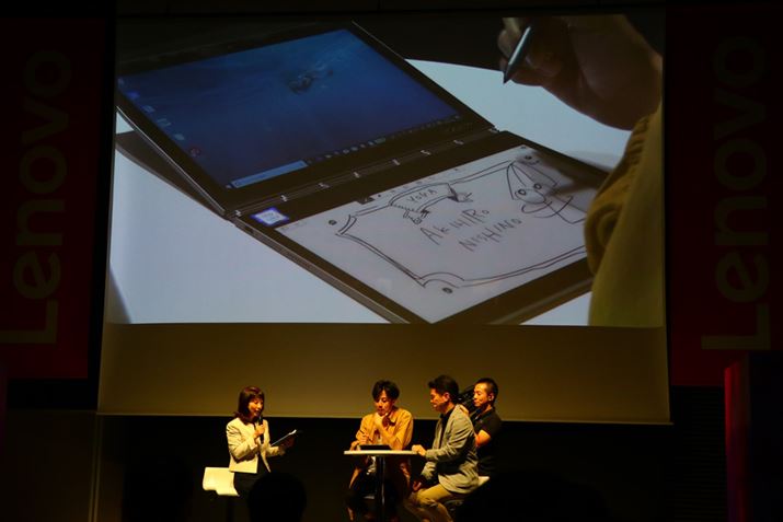 発表会では絵本作家としても活躍するキングコングの西野亮廣さんが登場し、Yoga Book C930を使って、即席でイラストを作成。絵本制作中にスタッフへ指示する際、これまで手書きでメモを取って、それを写真に撮影して送っていたという西野さん。Yoga Book C930なら、手書きでメモが書けて、それをコピーしてすぐに送れる利便性や、本体の軽さを高く評価していた。