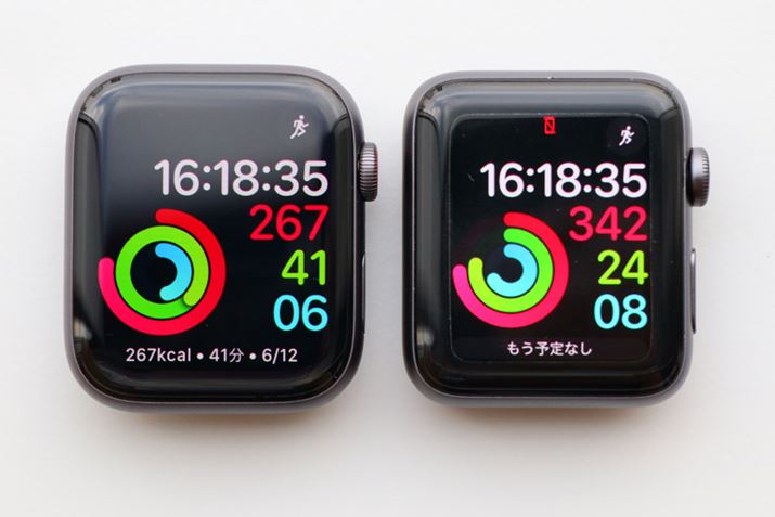 左が44mmのApple Watch Series 4、右が42mmの「Apple Watch Series 3 Nike+」。大きくなったとはいえ、違いは2mmなので、比べてみないとその違いはわかりにくい