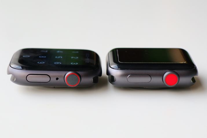 GPS+Cellularモデルのデジタルクラウンの赤色のレイアウトが変わっている。左がApple Watch Series 4で、右がApple Watch Series 3 Nike+