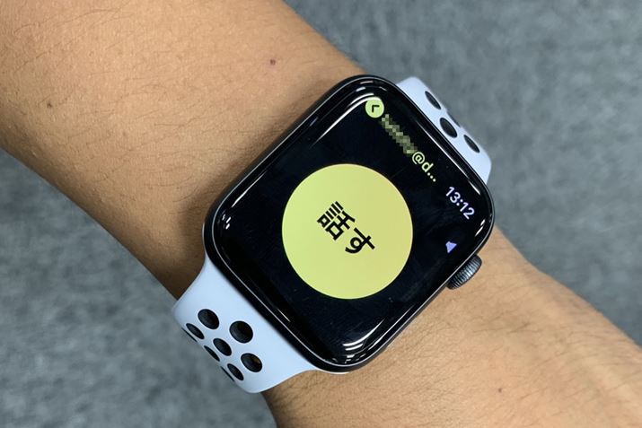 Apple Watchユーザー同士で会話ができるトランシーバー機能。「話す」と書かれた黄色い部分をタッチして話す。指を離すと相手の声が聞こえる