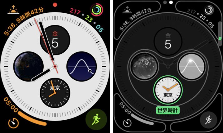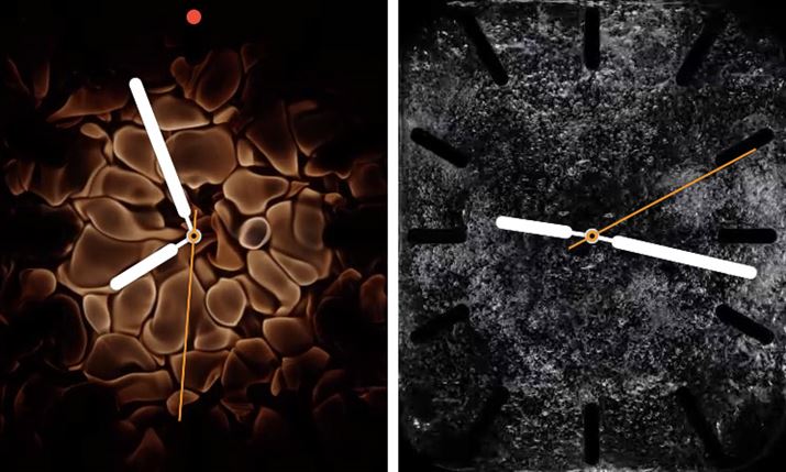 ディスプレイの大型化により、視認性が高まり、文字はもちろん写真なども見やすくなった。大きなディスプレイを活用した新しい文字盤「インフォグラフ」も用意。四隅に4つ、中央に4つの合計8つの「コンプリケーション」(アプリ)を表示しておける文字盤だ。また、「FIRE AND WATER」(火と水)など新しい動く文字盤デザインも追加されている。一見するとCGのように見えるが、実は実写したもので、画面端で炎が向きを変える様子は非常にリアルで、思わず見とれてしまう。
