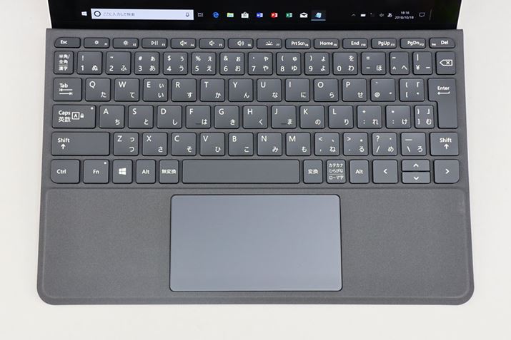 小型ゆえの一番の注意点は、Surface Go Signature Type Coverだろう。小さい割にはよくできているが、キーピッチは実測で17mmと少し窮屈で、手の大きい人は慣れるまで時間がかかるだろう。タッチパッドは広めで、複数の指を使ったジェスチャー操作が快適にできる。個体の問題かもしれないが、タイプすると「ポンポン」と高い音がするのが気になった。