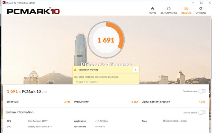 定番のベンチマークプログラムソフト「PCMark 10 Professional Edition」のスコアは1691。さすがに「Digital Content Creation」のスコアは低いが、日常使いやOfficeソフトの快適さを示す「Productivity」は2662とまずまずのスコア