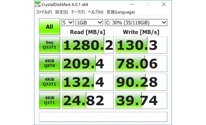 ストレージの速度を測定する定番ソフト「CrystalDiskMark 6.0.1 x64」の結果。最新のNVMe PCIe接続のSSDに及ばないものの、読み込み、書き込みともに高速だ
