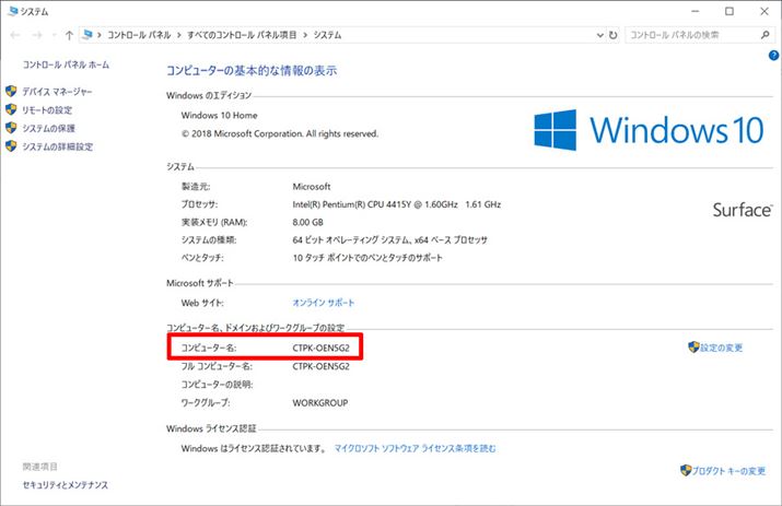 コンピューター名は、コントロールパネルの「システム」などで確認できる。「システム」はデスクトップアイコンの「PC」を右クリックして「プロパティ」を選ぶことでも表示できる