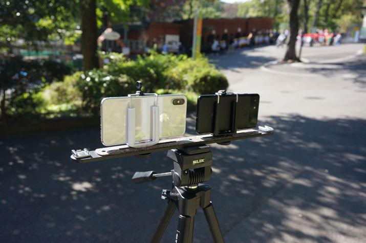 ここからは「Pixel 3」と「iPhone XS」で実際に撮影した映像の比較をしてみましょう。撮影は以下の写真の通り、両端末をひとつのリグに取り付けて行ないました。