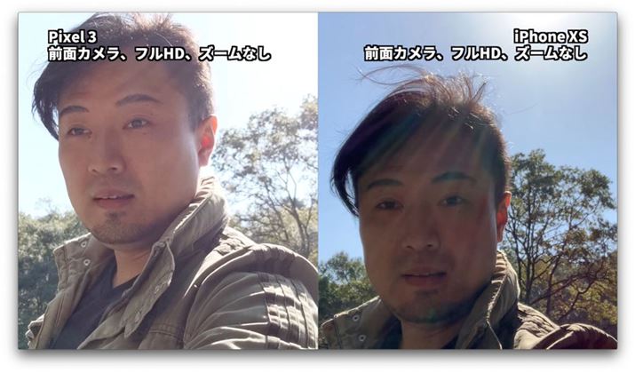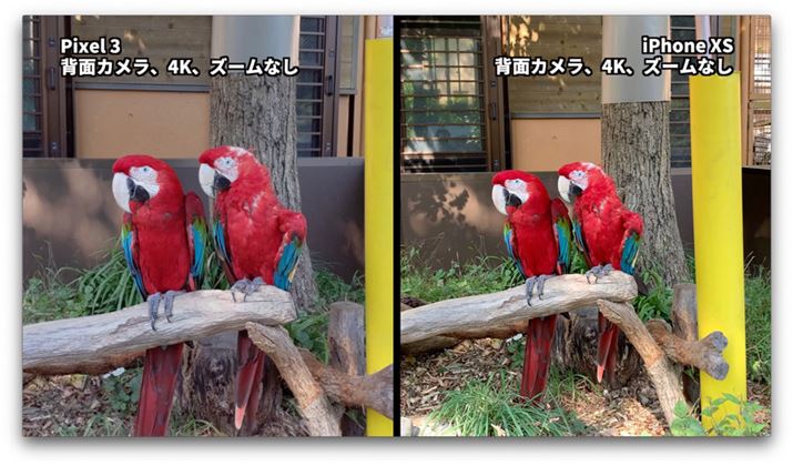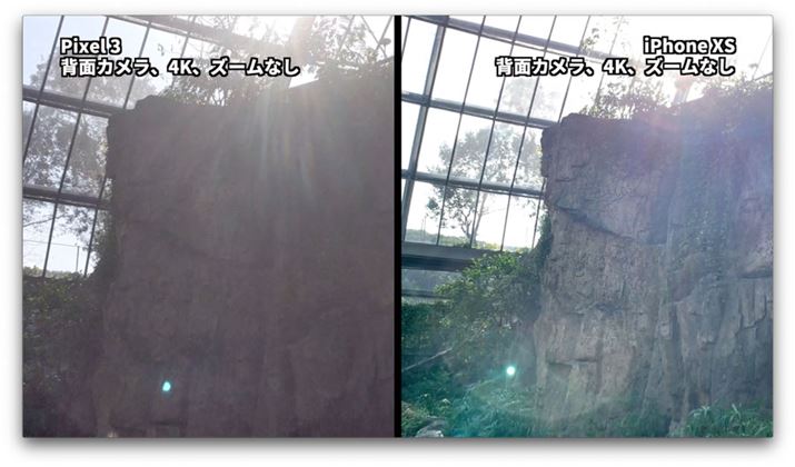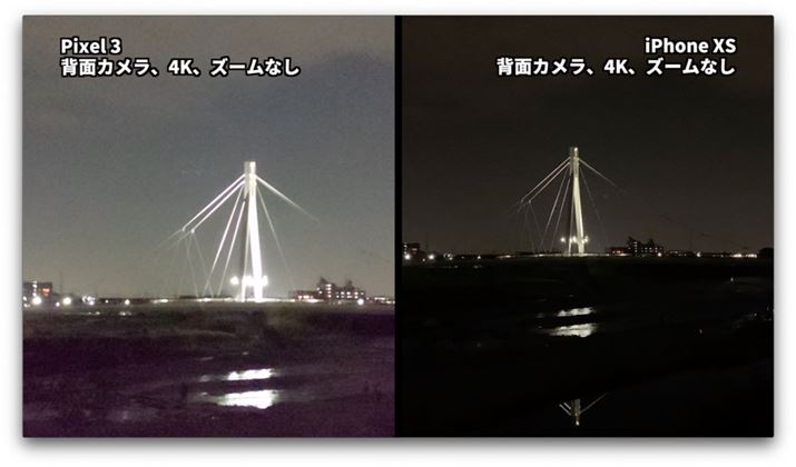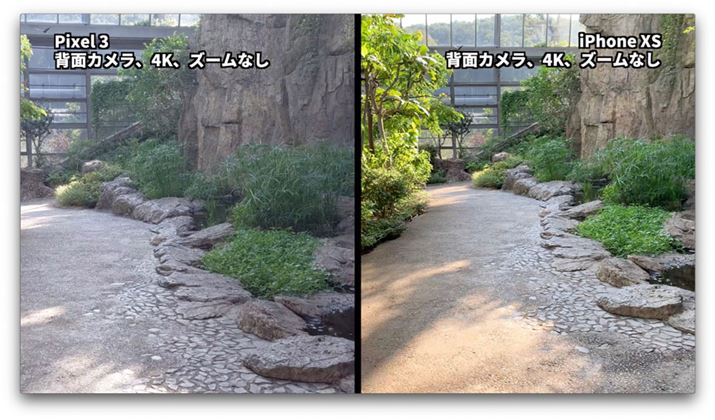 こちらの比較映像では、動画をカットして並べる以外は無加工で、「Pixel 3」「iPhone XS」から取り出したそのままのデータを使用しています。厳密には動画書き出しの際やYouTubeに書き出す時に圧縮がかかっていますが、ほぼ「撮ったまま」の映像と同じです。