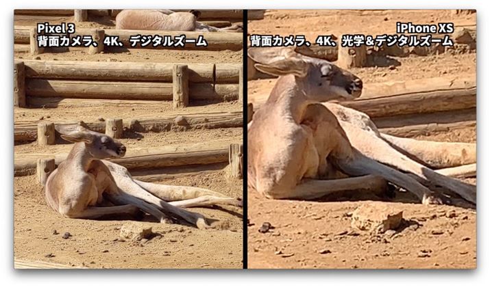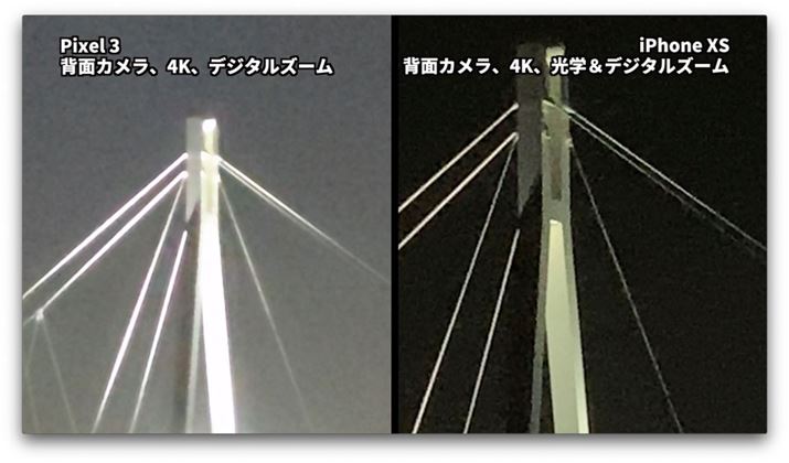 両端末の最大ズーム状態で撮影した映像の比較は以下の通り。「Pixel 3」はデジタルのみ、「iPhone XS」は光学とデジタルのミックスです。