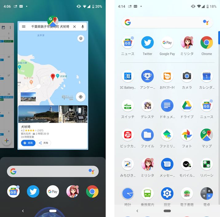 「Pixel 3」および「Pixel 3XL」は、最新のAndroid OS「Android 9.0 Pie」を採用しているが、そんな本機を使い始めると、すぐに、ホームボタンが今までと違うことに気付くだろう。画面下に備わるのは楕円形になった新しいホームボタンのみで、バックボタンは必要に応じて表示、タスクボタンは廃止された。新しいホームボタンはタップすればホーム画面に戻るが、左右にフリックすれば起動中のタスクの切り替え、長押しすればGoogleアシスタント呼び出し、上に2回フリックすればアプリの一覧画面が表示されるなど、多機能だ。以前からの機能を、より少ないボタンに集約させたが、操作はスムーズだ。最初はとまどうかと思ったが、なじむのに1日もかからなかった。なお、「Pixel 3」および「Pixel 3 XL」では、従来型のボタン配置への切り替えはできない。