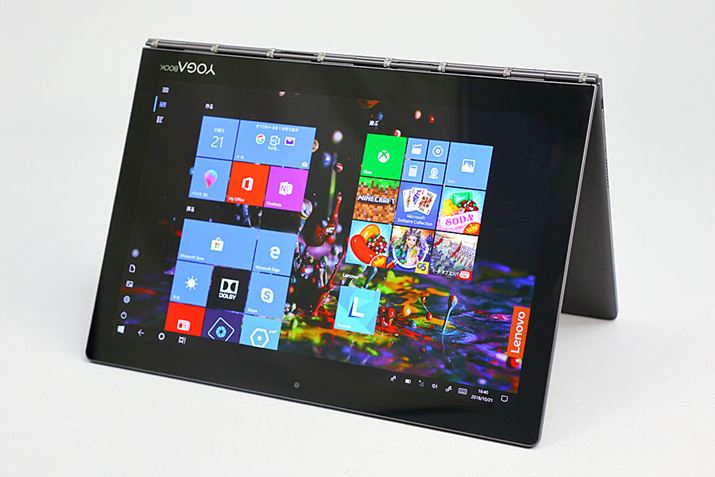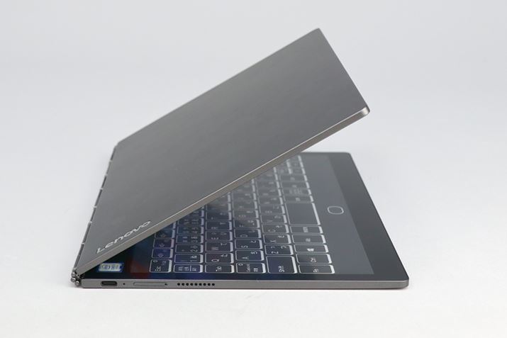 ほかのYOGAシリーズと同様、ディスプレイ部分が360°回転して、タブレットスタイルで利用できる。10.8型のメインディスプレイは高精細な表示で、動画や写真を見るのに向いている。E-Inkディスプレイばかり注目されるが、メインのディスプレイは、映り込みもよく抑えられており、表示品質は非常に高いと感じた。外部インターフェイスはUSB 3.1 Type-Cを左右に1基ずつ搭載するほか、microSDメモリーカードスロットも備える。USB 3.1 Type-Cは充電にも利用するので、2基あるのはありがたい。