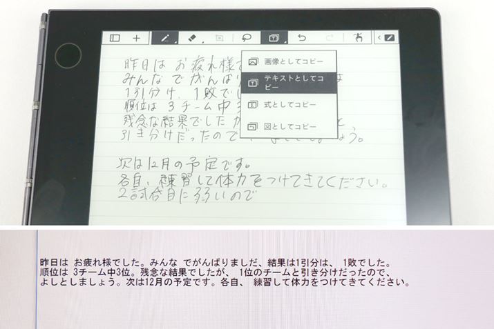 メモをした内容を「テキストとしてコピー」すると、Windowsのメモ帳などに貼り付けられる。スクリーンキーボードを使うよりも便利かもと思うほど、その精度は非常に高かった