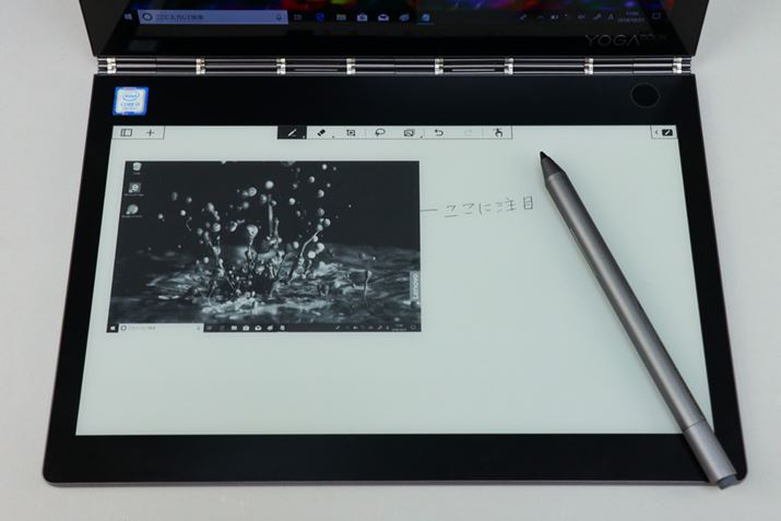E-Inkディスプレイには、スクリーンキーボード以外にも使い道がある。まずは、付属の「Lenovo Precision Pen」を使った手書き入力。Webページを見ながらメモを取ったり、アイデアをスケッチしたり、さまざまな使い方が可能だ。