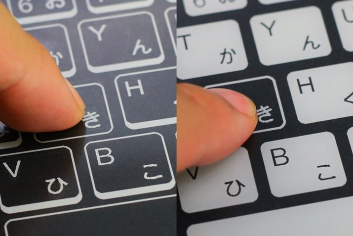 アニメーションの例。ブラックの場合、タッチすると白の影がなくなり、視覚的にタイプしているように見せている。ホワイトの場合はタッチしたキーが黒くなる