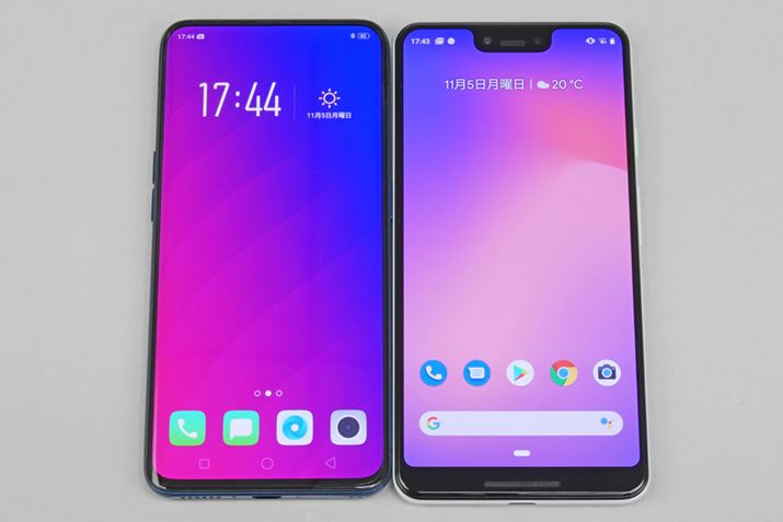 「Find X」(左)をほぼ同じ本体サイズの「Pixel 3 XL」(右)と比較。「Find X」のディスプレイは、フレームをさえぎるモノが一切なく、美しい