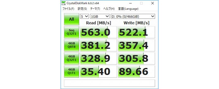 ただ、スペックシートからだけでは実際の性能までは見えてこない。ということで、ベンチマークプログラム「CrystalDiskMark 6.0.0 x64」を使って実際のデータ転送速度を測定してみた。テストに使用したのは、「BarraCuda SSD」の500GBモデル。テストの結果は以下に掲載するが、読込速度が563MB/秒とメーカー公称値をわずかながら上回る速度をたたきだした。書込速度は522MB/秒とスペックシートを若干下回ったが、それでも十分に高速。これぞSSDと言える結果だ。