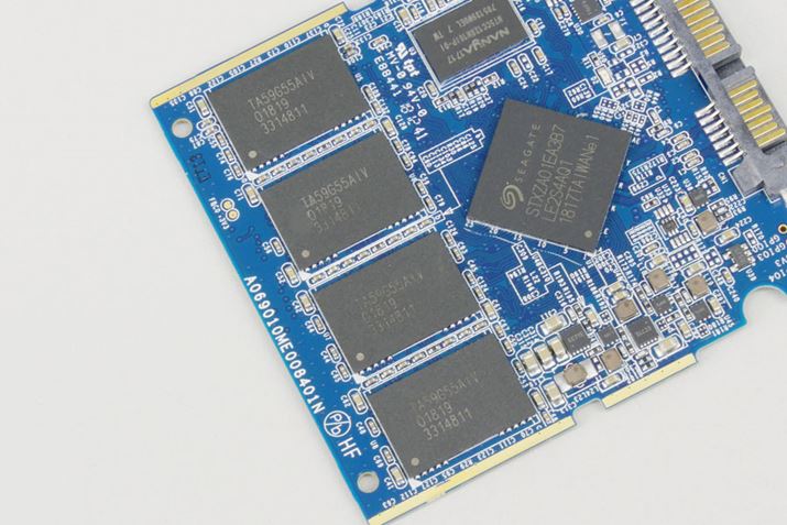 「BarraCuda SSD」のケースを取り外して中身をチェック。左側に4つ並んだNAND型フラッシュメモリーに表記された「TA59G55AIV」は東芝製であることを意味する。また、コントローラーはシーゲイト製、DRAMキャッシュメモリーはNanya Technology製を採用する
