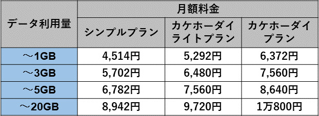 ウルトラギガモンスター+契約時の月額料金一覧(2年契約あり)