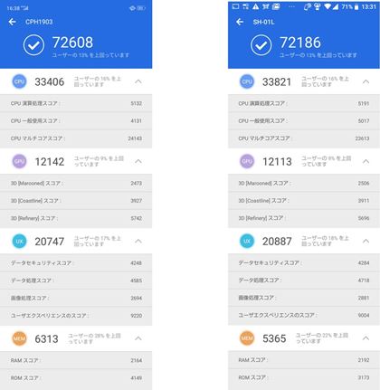 左が本機、右が「AQUOS sense2(ドコモ版SH-01L)」のベンチマークスコア。SoCが同じなので、総合スコアやサブスコアの傾向はいずれもよく似ている