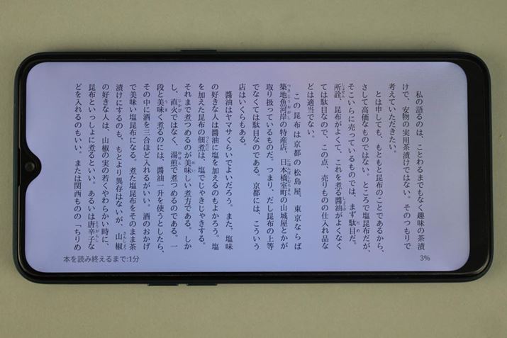 約6.2インチの大画面の割に解像度が低めなので、細かな文字を表示させた際、漢字に振られたルビなどが少しぼやけて感じることがあった