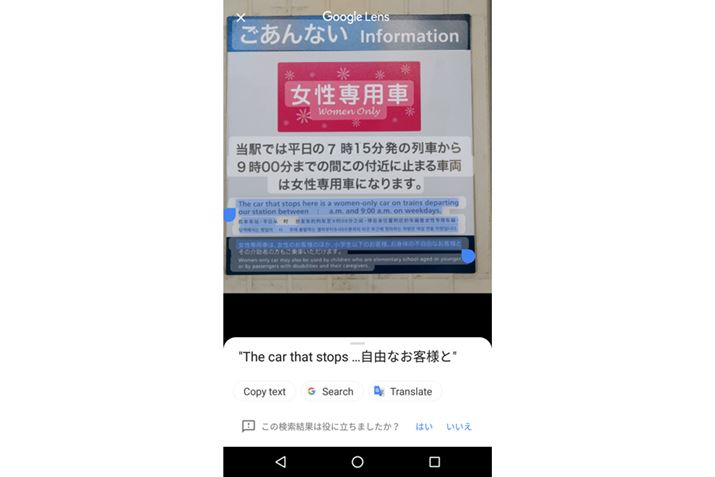 Googleレンズでは、たとえばカメラに写っている動物やランドマークなどを認識して情報を表示したり、文字を認識してテキスト情報として表示してくれたりする。「Playストア」で単体のアプリとして提供されているが、「Googleアシスタント」または「Googleフォト」内でも利用できる。