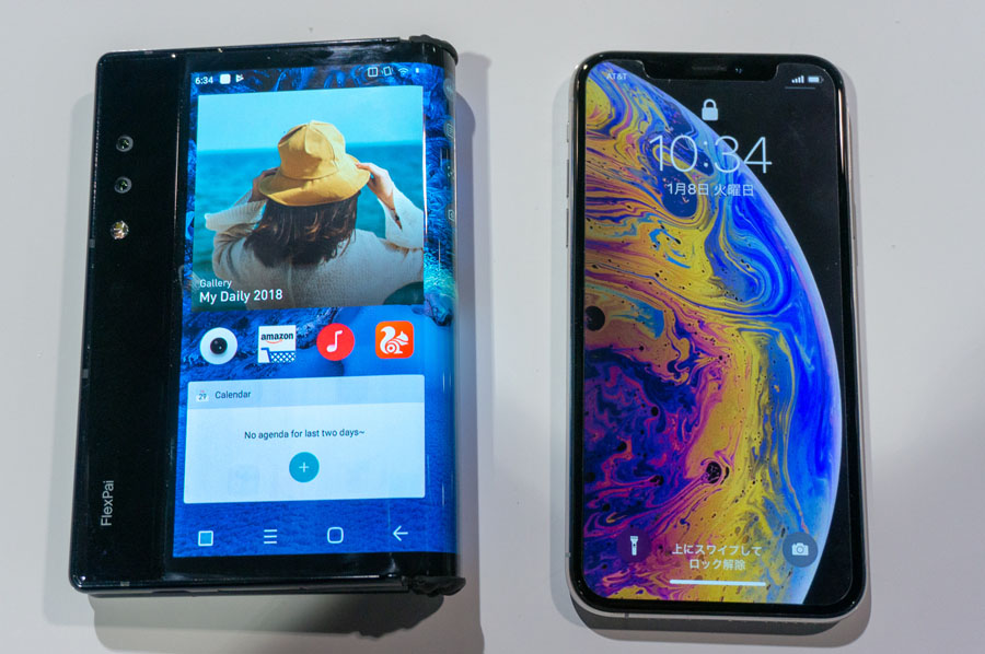 「FlexPai」(左)と「iPhone XS」(右)の比較