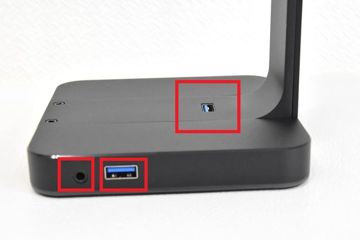 台座の右側面。画像左からヘッドホン入力端子、USB 3.1ポート(Type-A)を備える。さらに、上面には、もうひとつのUSB 3.1ポート(Type-A)が見える