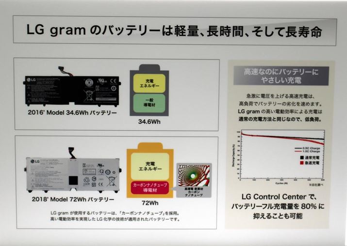 ボディとともに特徴的なのが、約22時間というバッテリーの駆動時間だ。本機は、72Whの大容量リチウムイオンバッテリーは、電極部分に、通電効率にすぐれたカーボンナノチューブを使うことで、エネルギー密度を高め、ボディの軽量化にも貢献している。発熱も抑えられるため、急速充電時のバッテリーの劣化も抑える。なお、急速充電は、同梱のACアダプターではなく、別売りのUSB PD(USB Power Delivery)充電器で行う。