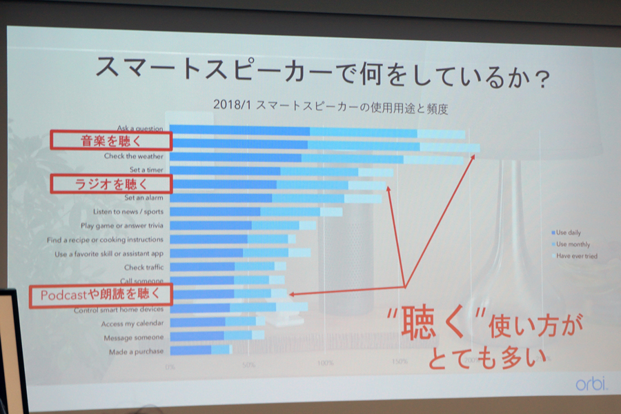 スマートスピーカーの利用状況。特に“聴く”ことに関してユーザーの利用頻度が高いという