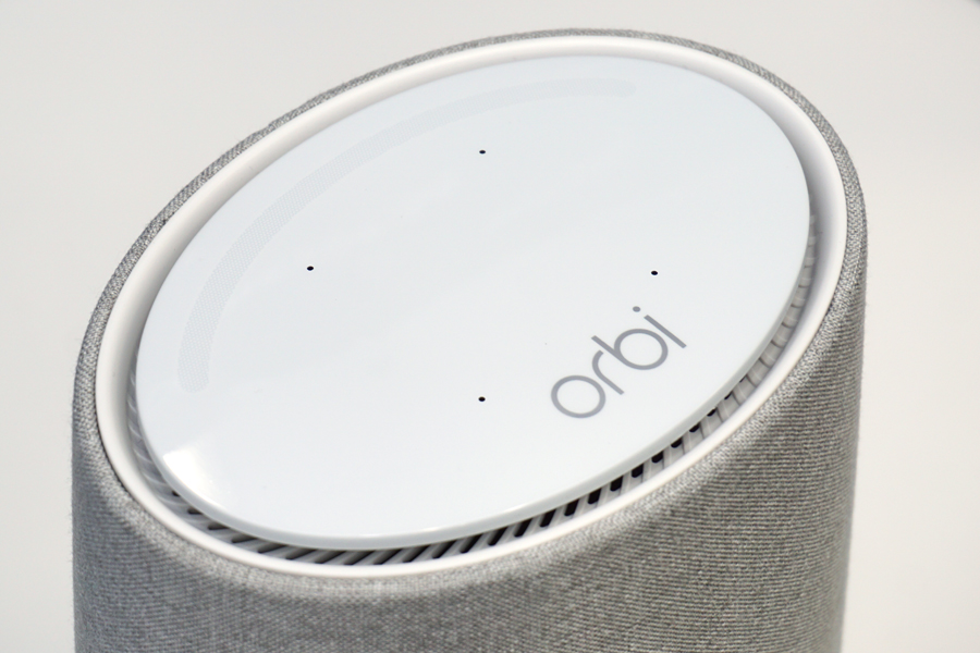 まず最初に発表されたのが、メッシュWi-Fiシステム「Orbi」に対応する子機「Orbi Voice サテライト」だ。最大の特徴は、Amazonが展開する音声アシスタント「Alexa」を搭載したこと。3.5インチウーハーと1インチツイーターを組み合わせた最大35W出力のHarman Kardon製スピーカーシステムとAlexaを本体に内蔵しており、メッシュWi-Fiシステムの子機としてだけでなく、Alexa対応スピーカーとしても機能させることができる。