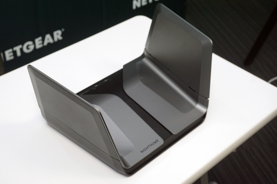 続いて発表されたのが、ハイエンドWi-Fiルーター「Nighthawk」シリーズの新モデル「Nighthawk AX8」。IEEEE802.11acと比べ、接続台数を4倍、スピードを40%、エリアを50%拡大させたというWi-Fiの次世代規格「Wi-Fi6」(IEEEE 802.11ax)に対応した同社初のWi-Fiルーターとなる。