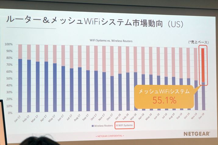 同社のお膝元であるアメリカでは、Alexaなどのスマートスピーカー、IoTデバイス、ゲームデバイス、スマート家電といったWi-Fiデバイスの普及が進み、高品質なWi-Fiエリアを拡大できるメッシュWi-Fiシステムの市場も急速に拡大。金額ベースで非メッシュWi-Fiタイプのルーター製品を超えるところまで成長しているという。