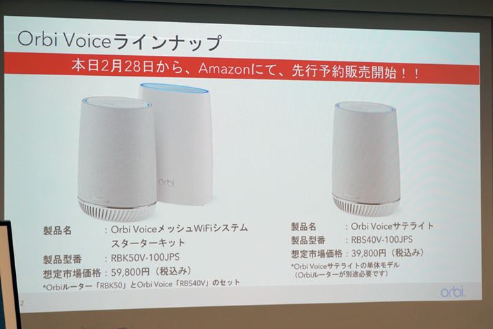 こちらも「Orbi Voice サテライト」同様、4月初旬の出荷を予定しており、本日からAmazon.co.jpにて先行予約の受付が開始されている。市場想定価格は49,980円(税込)だ。