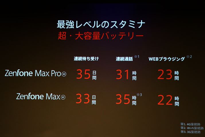 ASUSは2019年3月8日、大容量バッテリーが特徴のSIMフリースマートフォン「ZenFone Max」シリーズの新モデルを発表した。バッテリー容量が4000mAhの「ZenFone Max(M2)」と5000mAhの上位モデル「ZenFone Max Pro(M2)」の2機種を3月15日に発売する。