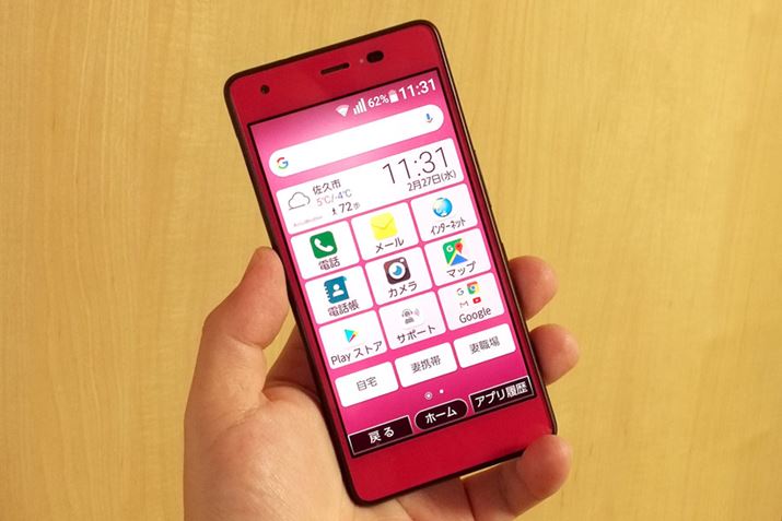 おてがるスマホ01の本体サイズは、145mm(高さ)×72mm(幅)×8.7mm(厚さ)。重さは136gです。写真のカラーバリエーションは「ルビーレッド」ですが、このほかに「アイアンブルー」も用意されています。