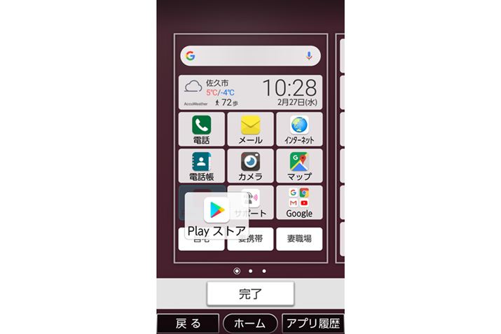 アイコンの配置は各画面3×6(横×縦)になっており、アイコンを長押しして移動させたり、ほかのアイコンとまとめてフォルダーを作成したりすることも可能です。並べられるアイコンの数は少なめですが、普通のスマホと変わらない機能を備えています。
