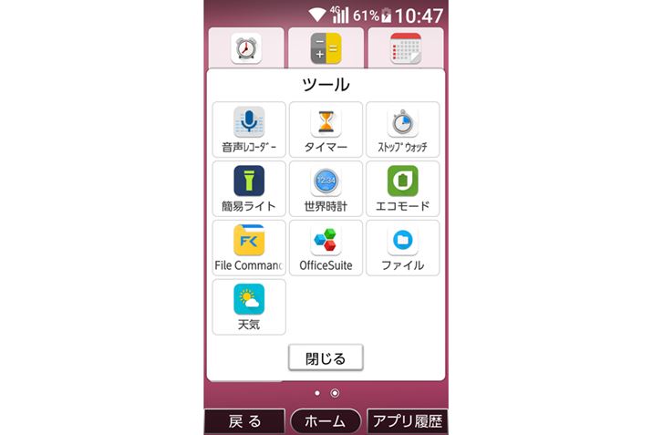 おてがるスマホ01には、実用的なアプリがあらかじめインストールされています。たとえば「ツール」フォルダーには、「音声レコーダー」「タイマー」「簡易ライト」といった日常生活で役立つアプリがまとめられています。