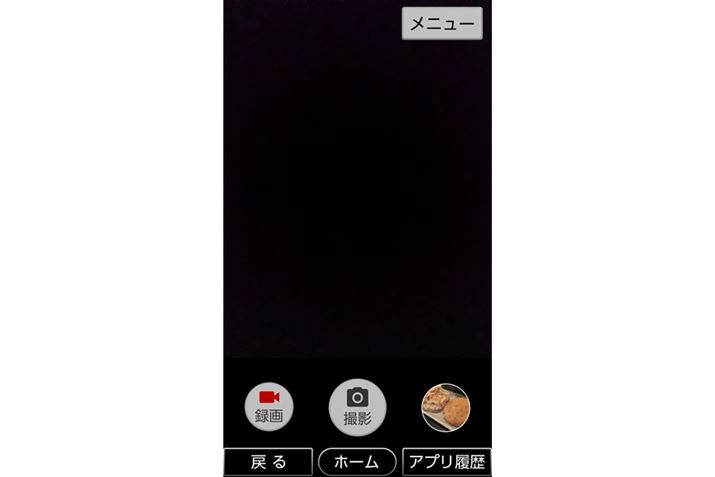 標準のカメラアプリは、必要最低限の機能だけを備えています。撮影画面には2つのシャッターボタン、撮影済みの写真を参照するためのボタン、「メニュー」ボタンしかありません。