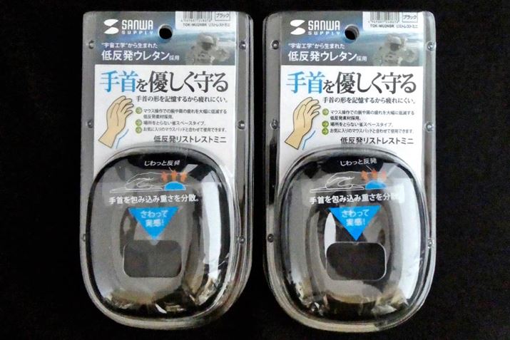 最後はマウス用のパームレストを2つ使って自在に位置を変えて自分だけのパームレストを作ってしまおうと思いました。サンワサプライの低反発ウレタン製の小さなパームレストです。デスクが狭い場合やマウスとの兼用もできるので、これはこれでアリな使い方かと思いますよ。